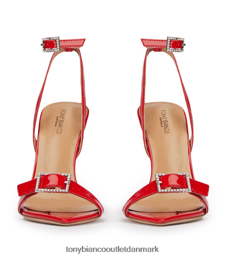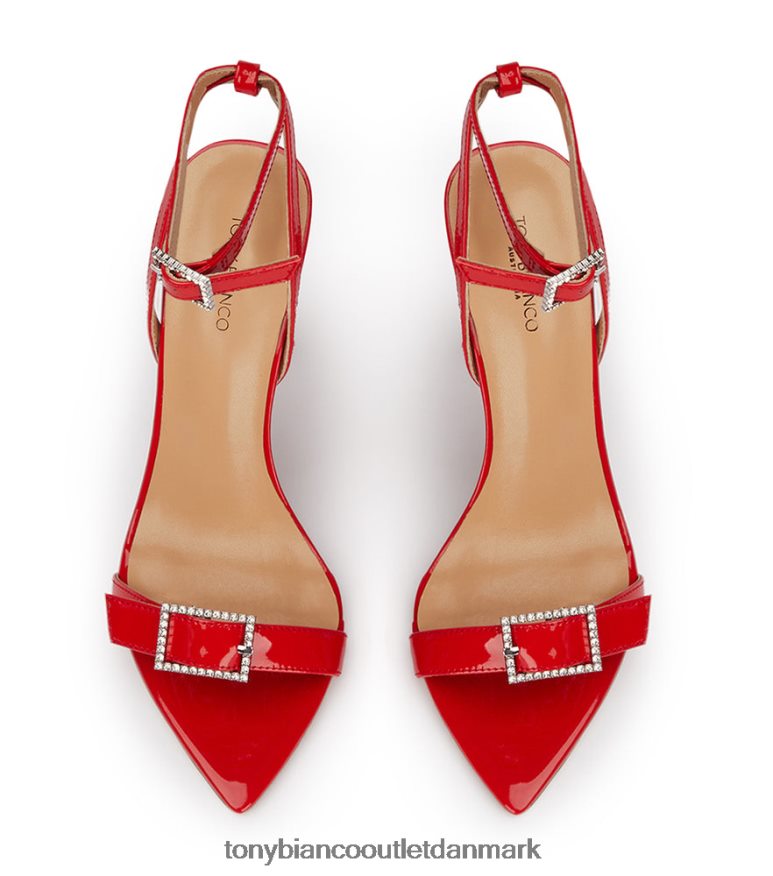 Den perfekte stilethæl er her. mød mopsy, en fed rød patenthæl med et spidstådesign og en slank ankelrem. afsluttet med et dekorativt diamantspænde foran og ankel.
