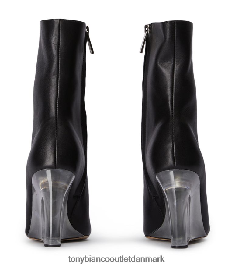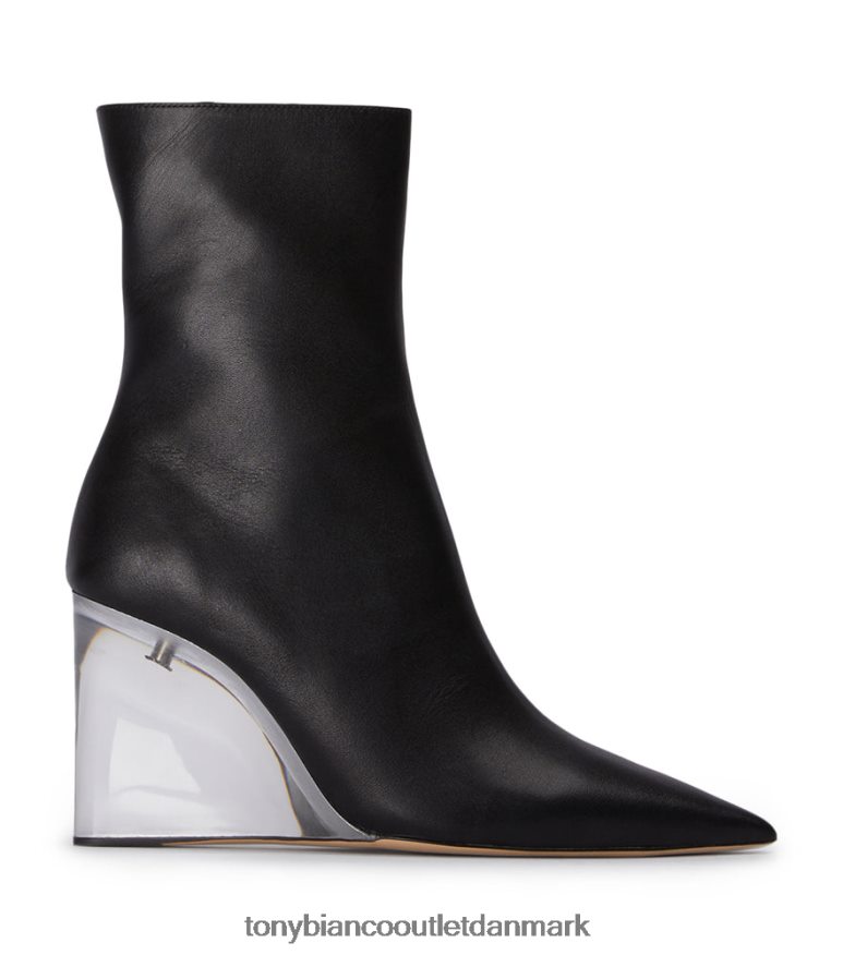mød dasha, ankelstøvle møder wedge møder ultimativ cool pige-chicness. fremviser en aflang spids tå, 9,5 cm gennemsigtig kilehæl og udformet med vores glatte sorte como-læder. hun er perfekt til hverdagsbrug hele året rundt.