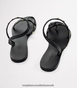 en sort lædersandal med tåring, rem på tværs af remmen og ankelgrime med guldtonet hardware.