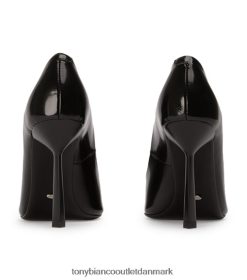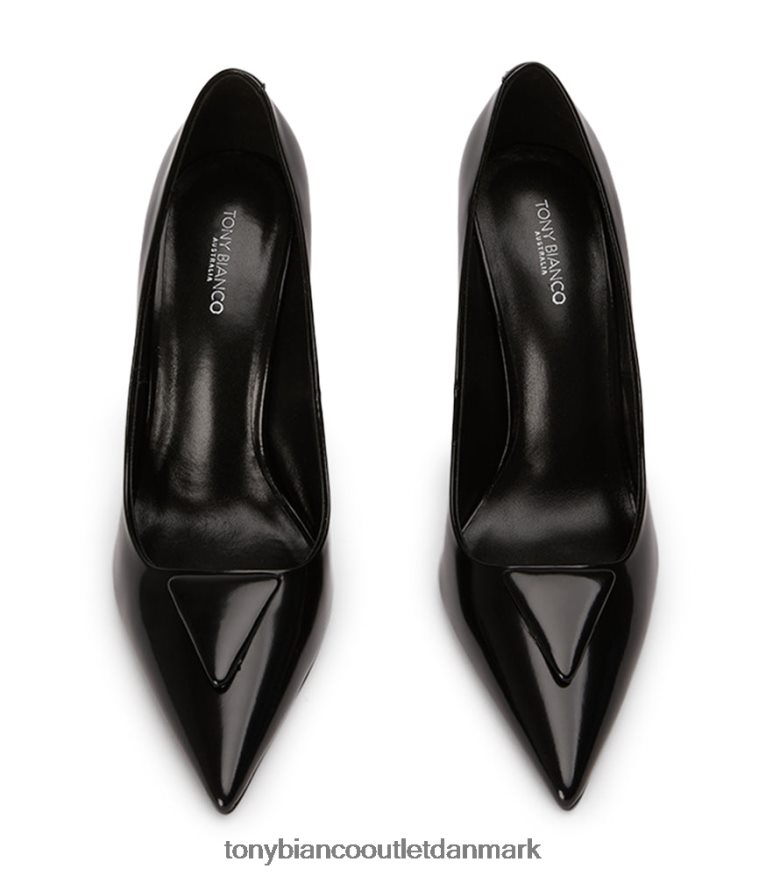 gema fanger moderne sofistikering og elegancen af en klassisk pumpe. med en kantet stilethæl, et slankt design på ryggen og trekantede plaquedetaljer. denne spidse bane er udformet med vores signatur sorte hi-shine læder for et raffineret og tidløst look.