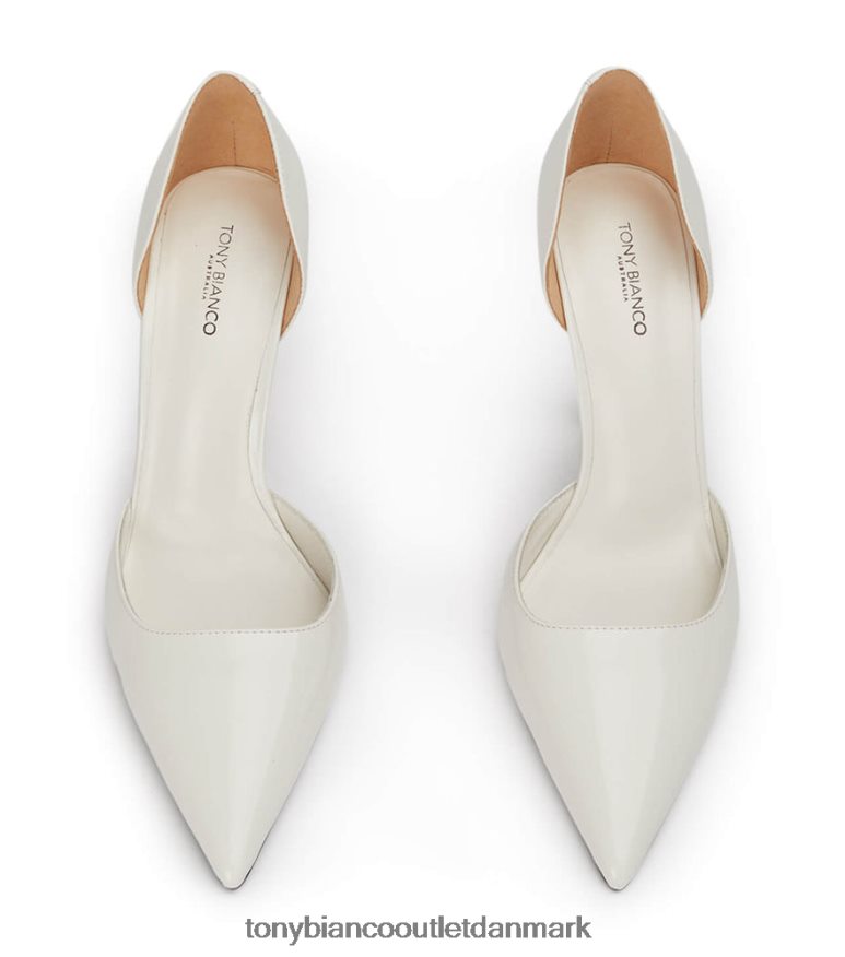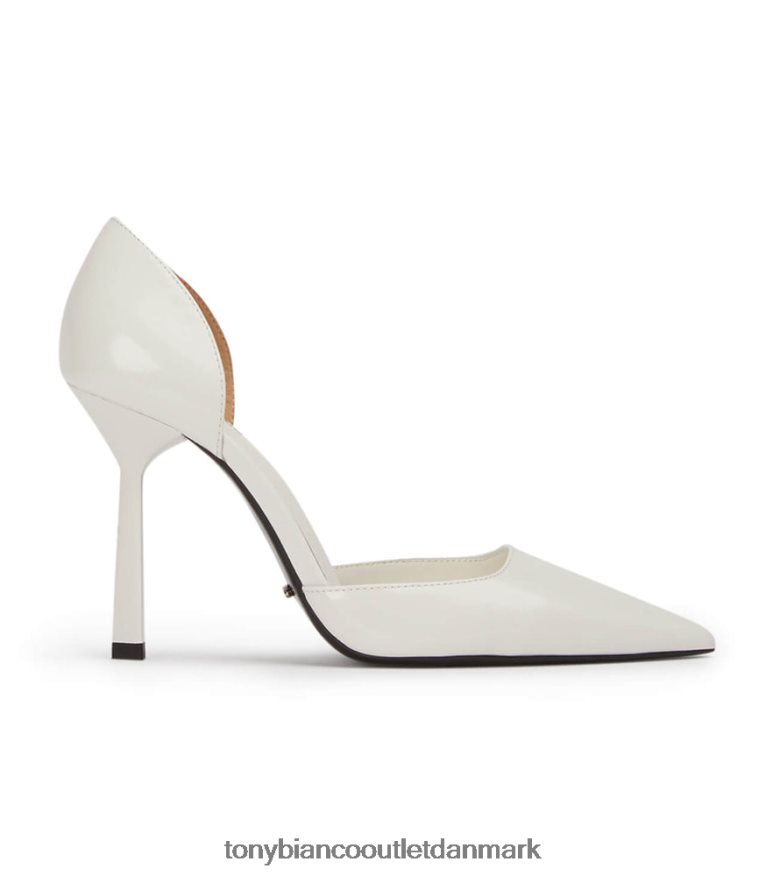 gør entré i galla. vores moderne fortolkning af den klassiske pumpe, med en elegant spids tå-form, asymmetrisk hæl og firkantet vamp. forenklet i design, denne hvide, hi-shine hæl vil sikre alsidighed hele sæsonen.