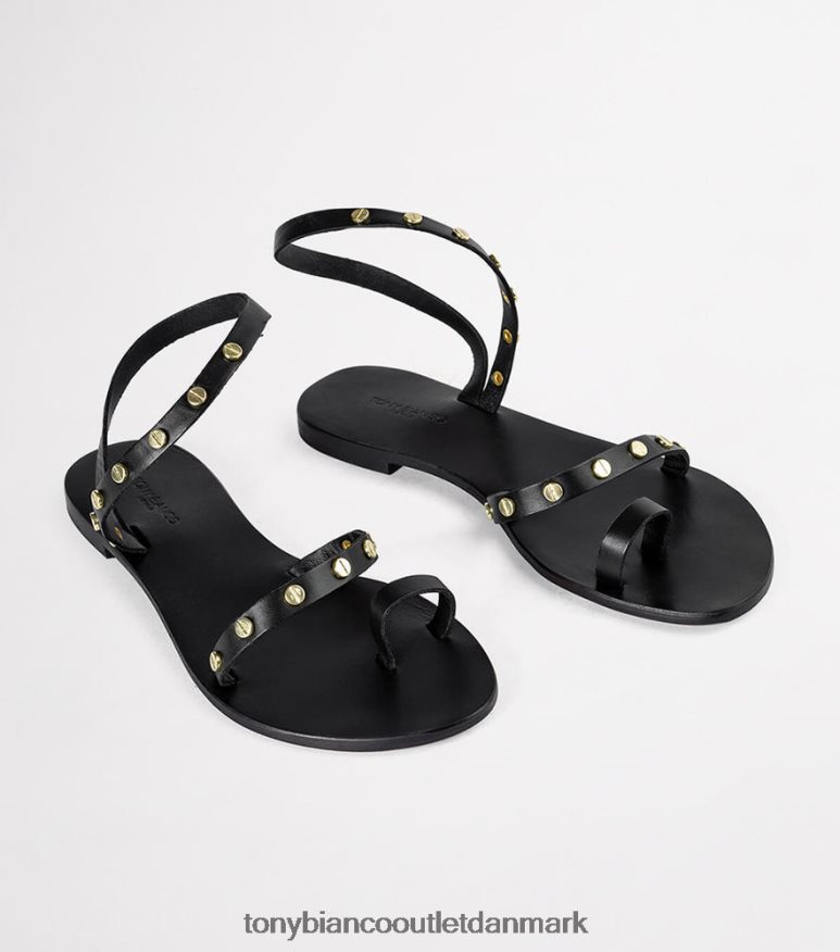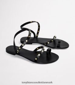 en sort lædersandal med tåring, rem på tværs af remmen og ankelgrime med guldtonet hardware.