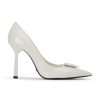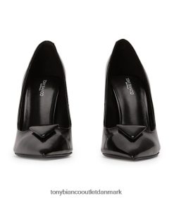 gema fanger moderne sofistikering og elegancen af en klassisk pumpe. med en kantet stilethæl, et slankt design på ryggen og trekantede plaquedetaljer. denne spidse bane er udformet med vores signatur sorte hi-shine læder for et raffineret og tidløst look.