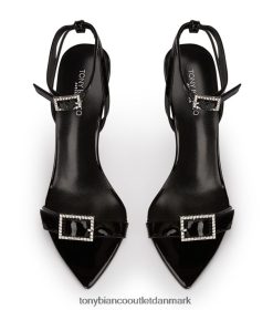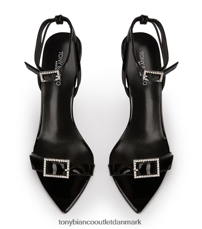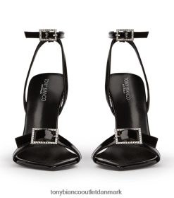 Den perfekte stilethæl er her. mød mopsy, en slank sort patenthæl med et design med spids tå og en slank ankelrem. afsluttet med et dekorativt diamantspænde foran og ankel.