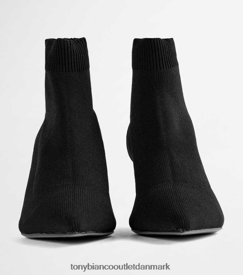 en sort ankelstøvle med spids tå, stilethæl og tekstureret strik.